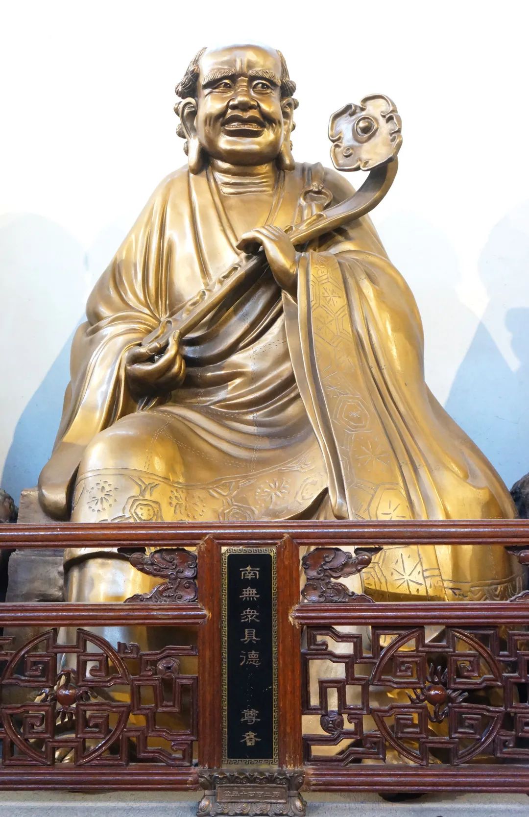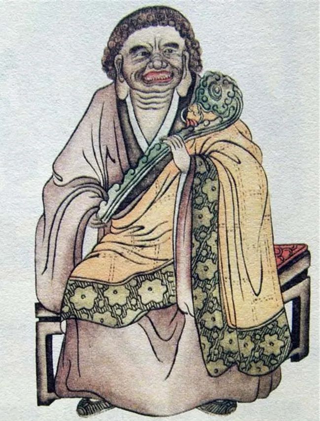 尊者法相所现为正面静坐,卷发大耳,面露笑容,双手于胸前持如意。
