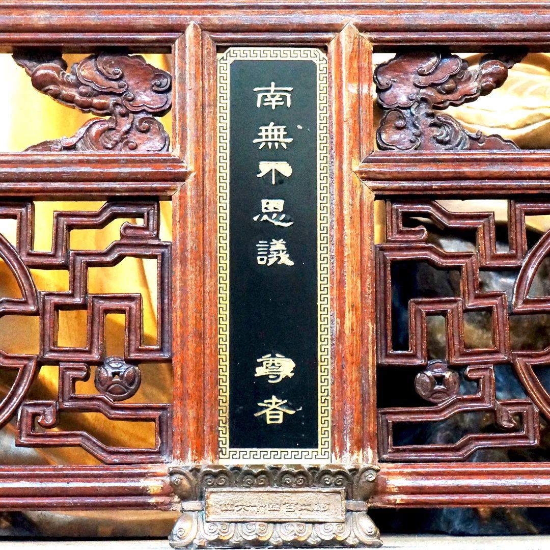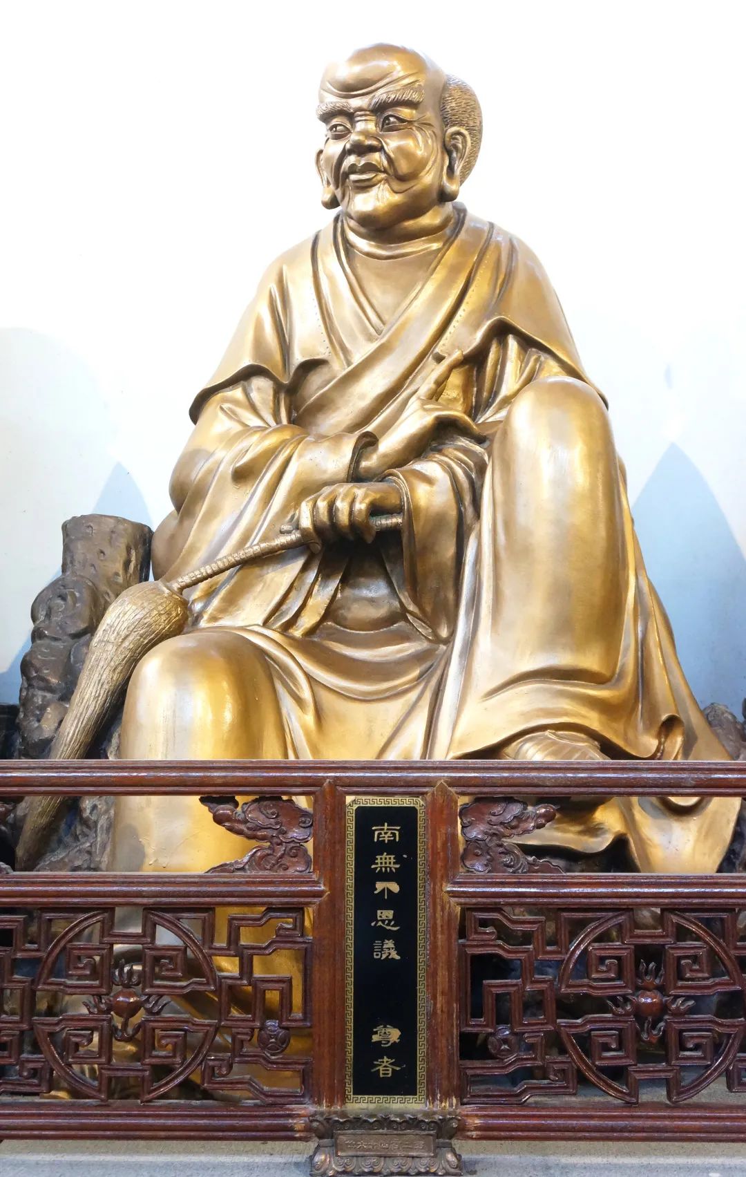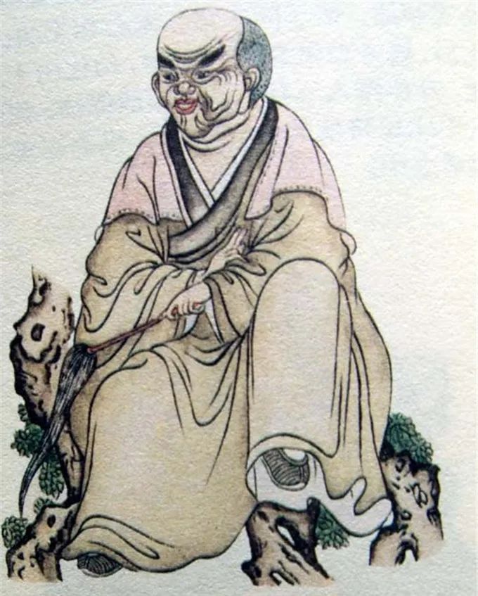 尊者法相所现为坐于假山之上,额头饱满,眼神侧视,左手执拂子,右手结印。