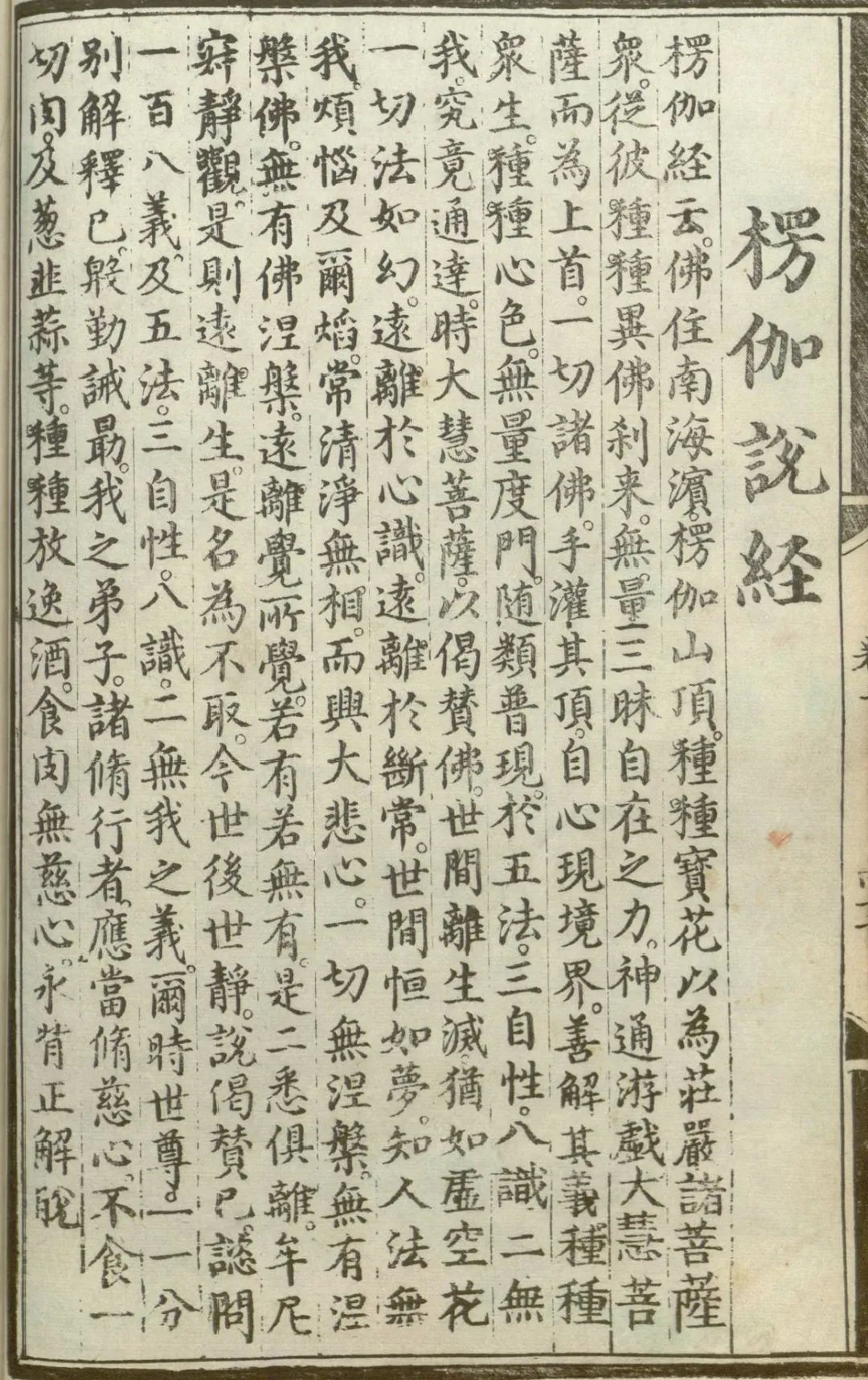 说偈赞已。谘问一百八义。及五法三自性。八识二无我之义。尔时世尊。一一分别解释已。殷勤诫勖。我之弟子诸修行者。应当修慈心。不食一切肉。及葱韭蒜等。种种放逸酒。食肉无慈心。永背正解脱。