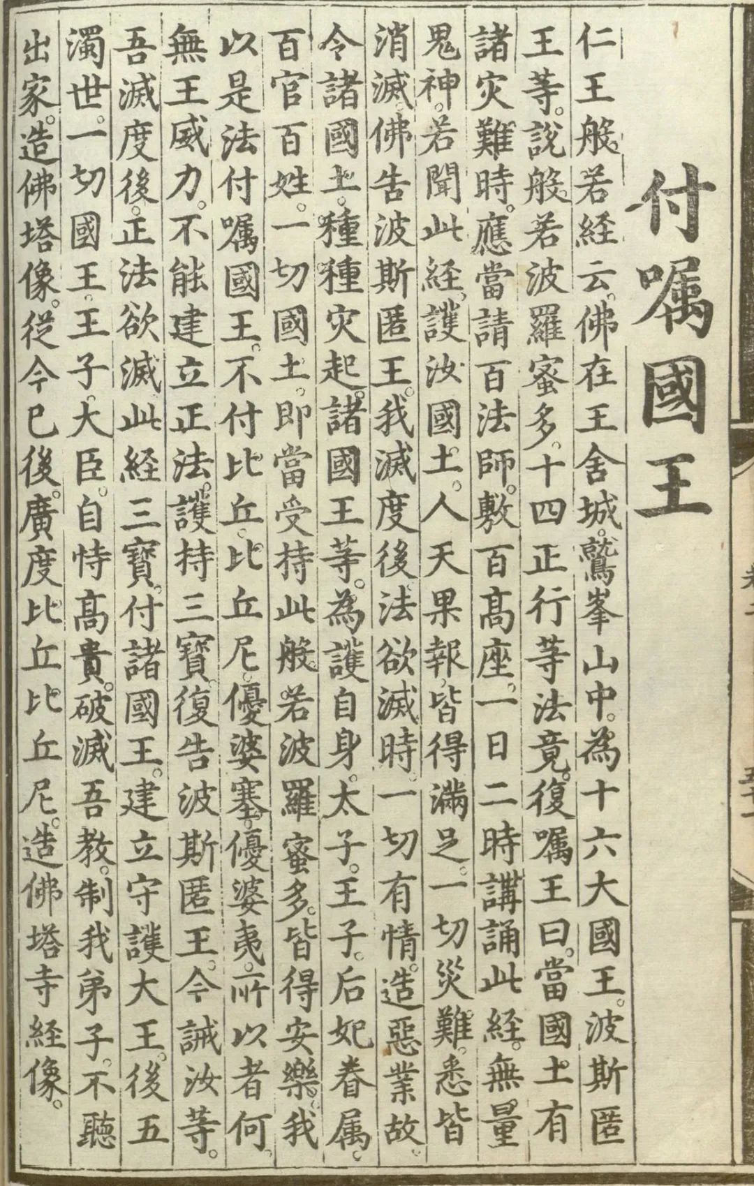 佛告波斯匿王。我灭度后。法欲灭时。一切有情造恶业故。令诸国土种种灾起。诸国王等为护自身。太子王子。后妃眷属。百官百姓。一切国土。即当受持此般若波罗蜜多。皆得安乐。我以是法付嘱国王。不付比丘。比丘尼。优婆塞。优婆夷。所以者何。无王威力。不能建立正法。护持三宝。