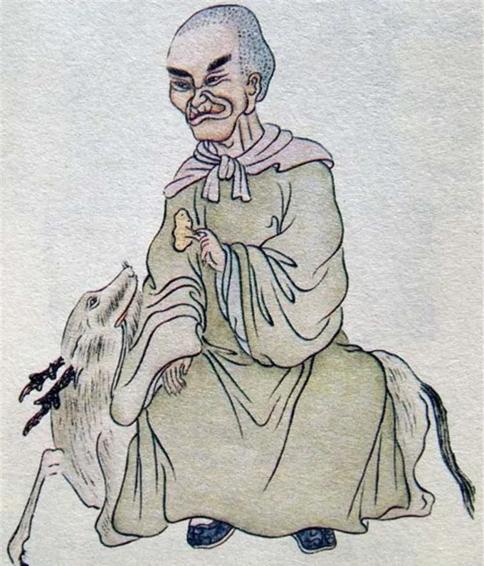 尊者法相所现为骑鹿而坐,浓眉大耳,左手拿灵芝做喂鹿状。