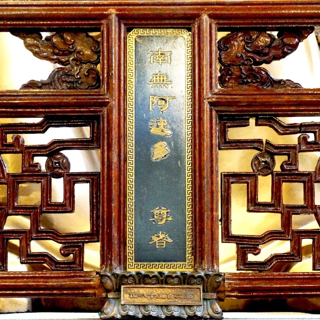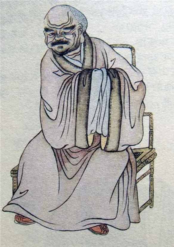 尊者法相所现为偏身而坐,剑眉浓须,面露笑容,双手笼于袖中。