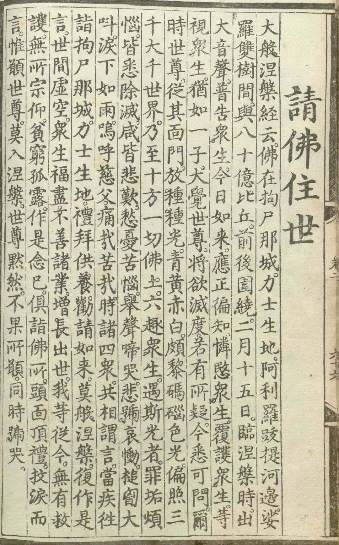 大般涅槃经云。佛在拘尸那城力士生地。阿利罗跋提河边。娑罗双树间。与八十亿比丘前后围绕。二月十五日临涅槃时。出大音声。普告众生。今日如来应正遍知。怜愍众生。覆护众生。等视众生犹如一子。大觉世尊将欲灭度。若有所疑。今悉可问。
