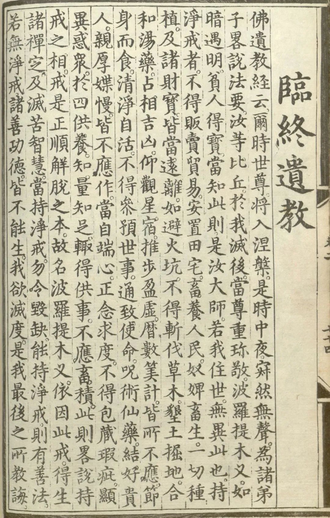 佛遗教经云。尔时世尊将入涅槃。是时中夜。寂然无声。为诸弟子略说法要。汝等比丘。于我灭后。当尊重珍敬波罗提木叉。如暗遇明。贫人得宝。当知此则是汝大师。若我住世。无异此也。持净戒者。不得贩卖贸易。安置田宅。畜养人民。奴婢畜生。一切种植。及诸财宝。皆当远离。如避火坑。不得斩伐草木。垦土掘地。合和汤药。占相吉凶。仰观星宿。推步盈虚。历数算计。皆所不应。节身而食。清净自活。不得参预世事。通致使命。咒术仙药。结好贵人。亲厚媟嫚。皆不应作。当自端心。正念求度。不得包藏瑕疵。显异惑众。于四供养。知量知足。趣得供事。不应蓄积。此则略说持戒之相。戒是正顺解脱之本。故名波罗提木叉。依因此戒。得生诸禅定。及灭苦智慧。当持净戒。勿令毁缺。能持净戒。则有善法。若无净戒。诸善功德。皆不能生。我欲灭度。是我最后之所教诲。