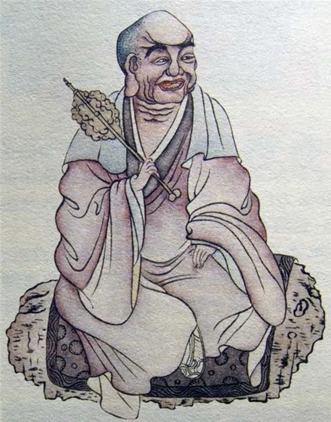 尊者法相所现为正面而坐,凸额大耳,面露笑容,右手持法器。