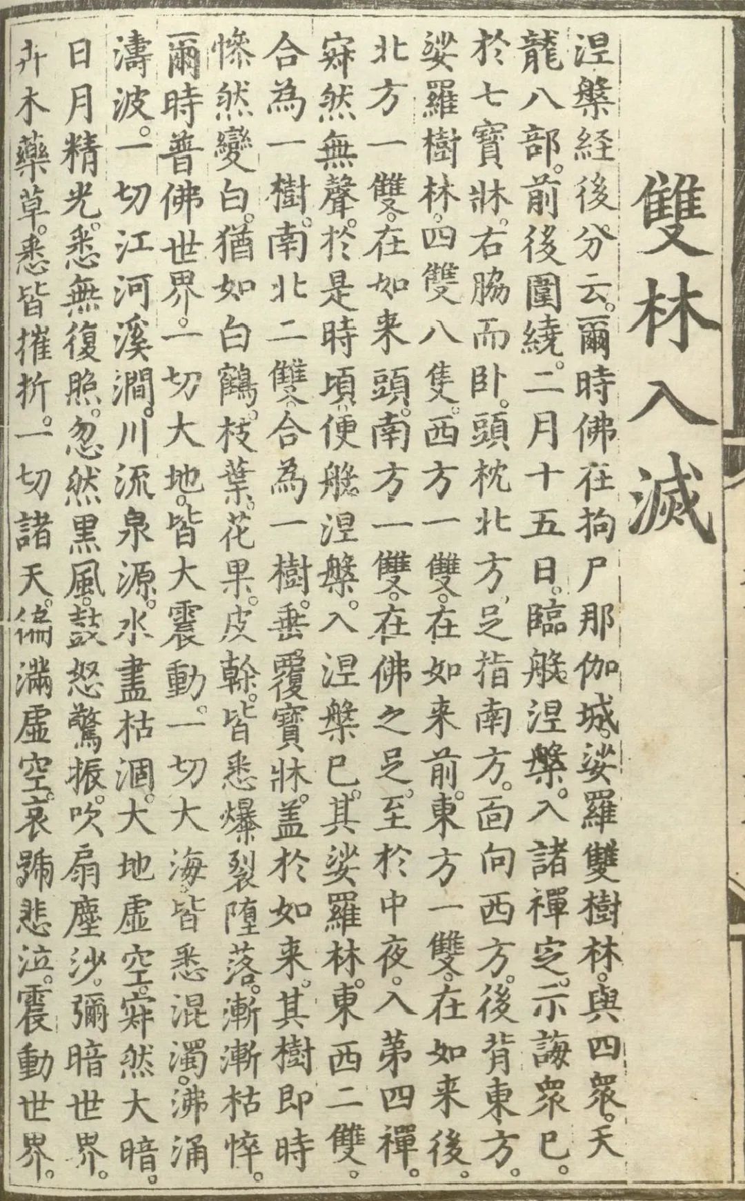 娑罗树林四双八只。西方一双在如来前。东方一双在如来后。北方一双在如来头。南方一双在佛之足。至于中夜。入第四禅。寂然无声。于是时顷便般涅槃。