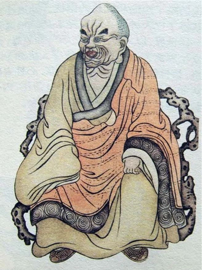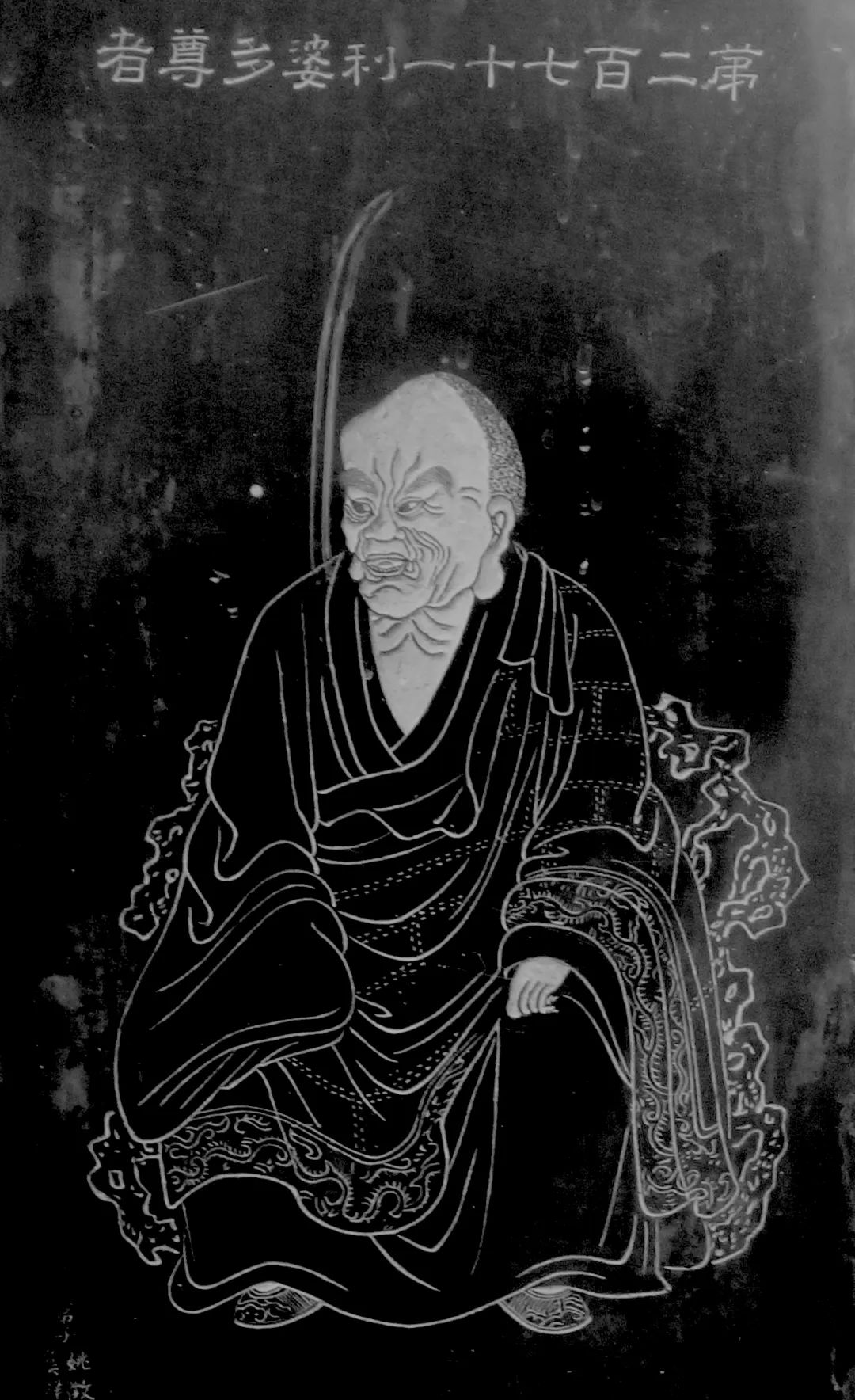 尊者法相所现为端身正坐,头顶尖凸,面容紧皱,双手置于两膝。