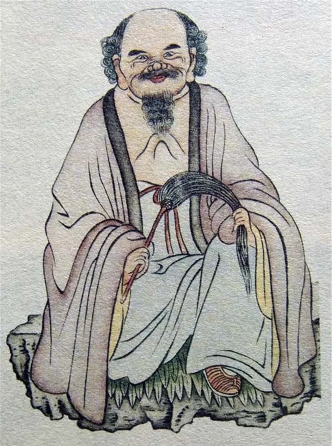 尊者法相所现为正面而坐,鬈法长须,面露笑容,双手持拂子。