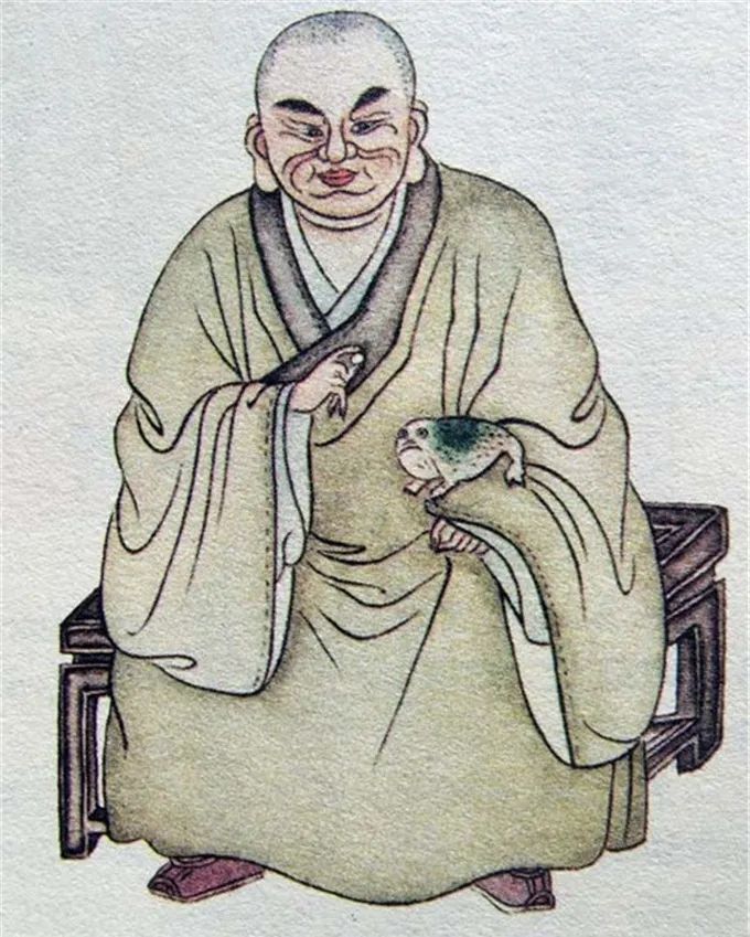 尊者法相所现为正面静坐,浓眉大耳,左手上坐一蟾蜍,右手持药丸。