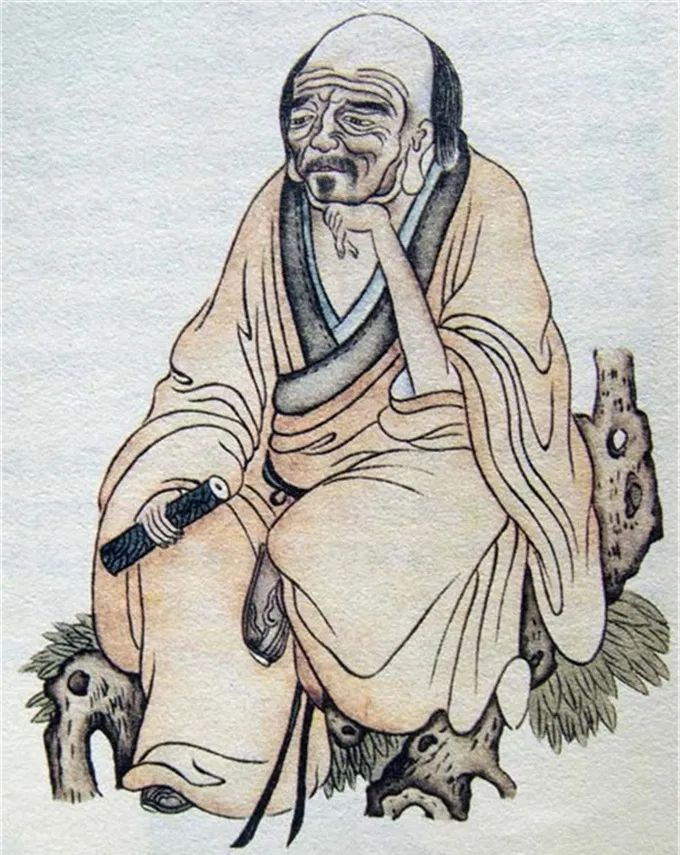 尊者法相所现为正面而坐,神态威严,右手执经卷,左手托下巴作思考状。