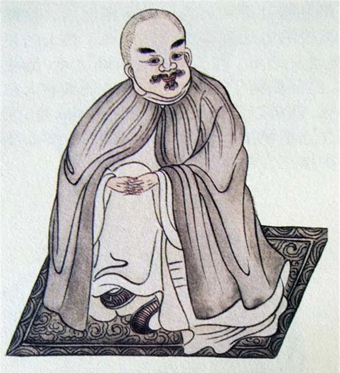 尊者法相所现为正面而坐,浓眉大耳,双手抱膝。