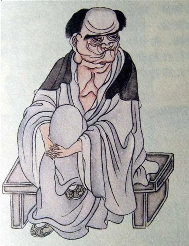 尊者法相所现为正面而坐,神态严肃,右脚翘起,双手交叉抱膝。