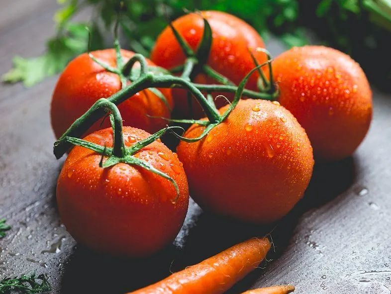 番茄,性平,味酸微甘,富含蛋白质、脂肪、无机盐、烟酸、维生素C、维生素B1、维生素B2及胡萝卜素。具有清热解毒、凉血平肝之功效,生熟食用均可。
