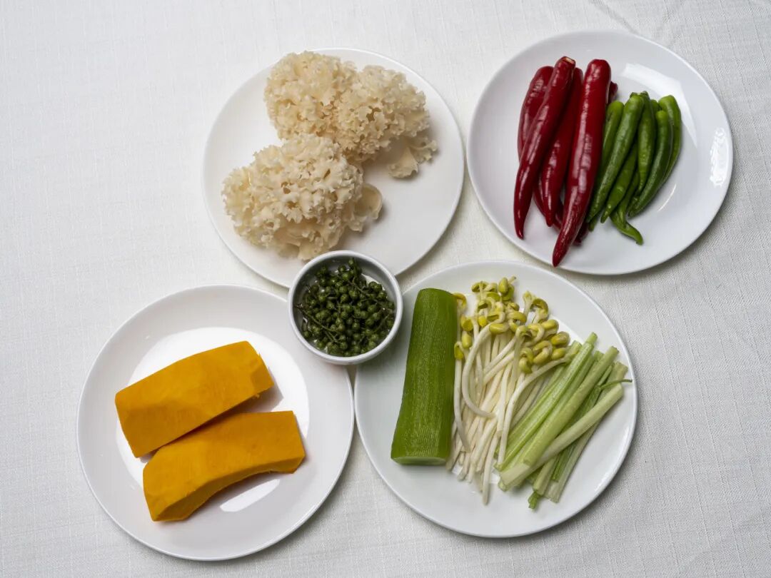 绣球菌、莴笋、黄豆芽、香芹、青椒、红椒、花椒、杭椒、番茄、南瓜汁、香菜等。