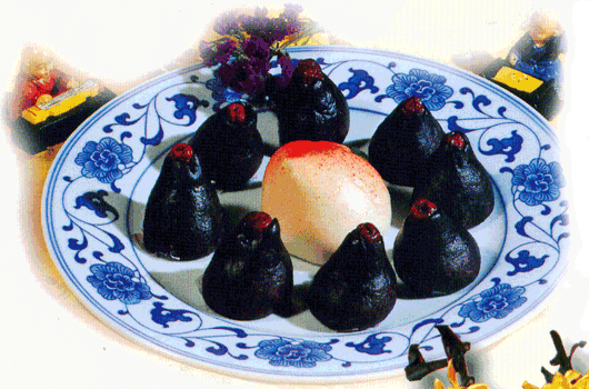 2.将精白面粉、白糖、发酵粉、香米、水混合在起,揉成面团,摘成剂子,做成窝头生坏,并在每个生坯顶端嵌入一颗红枣,上笼蒸熟即成。