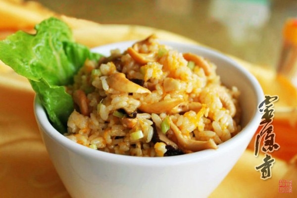 2、净锅、放入少许油、放入香菇丝煸出香味加入南瓜、加入调料、加少许水;将南瓜炒熟、水份收干、再加入米饭、香芹末、炒匀撒上腰果出锅装入盛器中即可