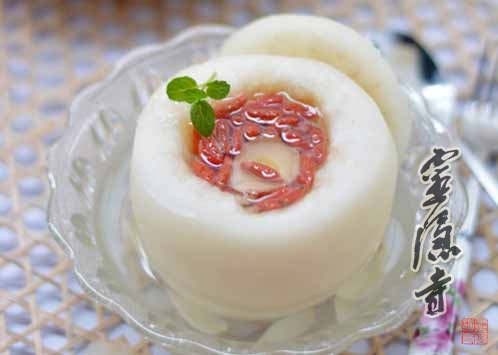 百合性微寒平。味甘微苦;入肺经;具有润肺,清火,安神的功效。梨子清热降火生津,润肺化痰止咳,去燥养血生肌。燥咳,痰热失声,便秘。老冰糖:味甘;补中益气,和胃润肺,止咳化痰。养阴生津,润肺止咳。