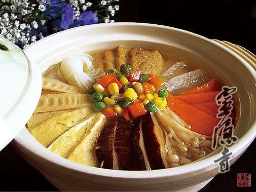 原料:烤麸、香菇、竹笋、磨芋粉丝(或者普通耐煮的红薯粉丝)、胡萝卜、金针菇、素鸡、冬瓜。