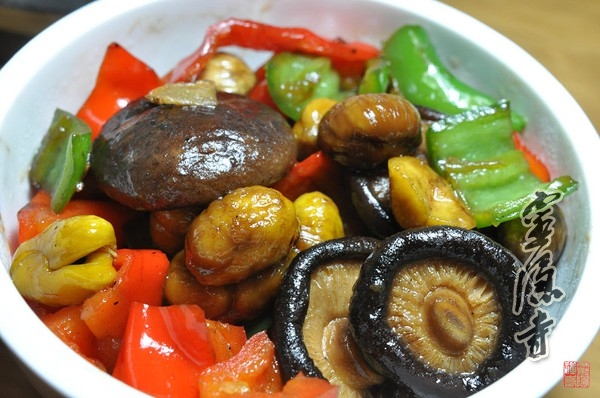 栗子、香菇、青椒、红椒、盐1/2小匙、老抽1小匙、生抽1小匙、姜两片