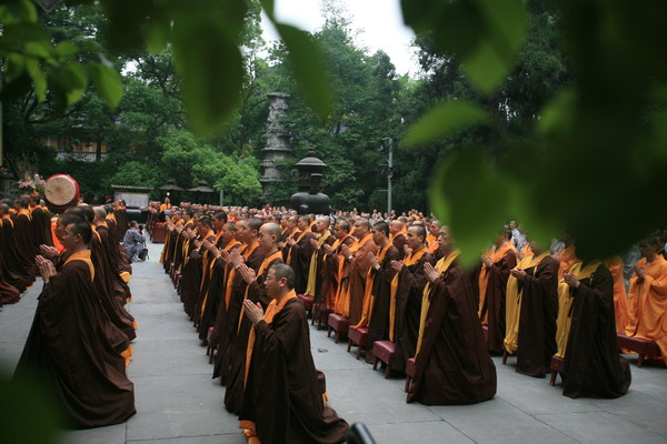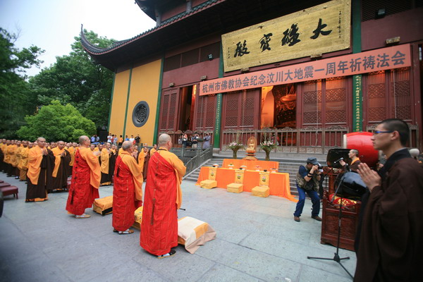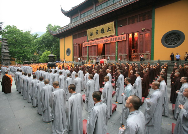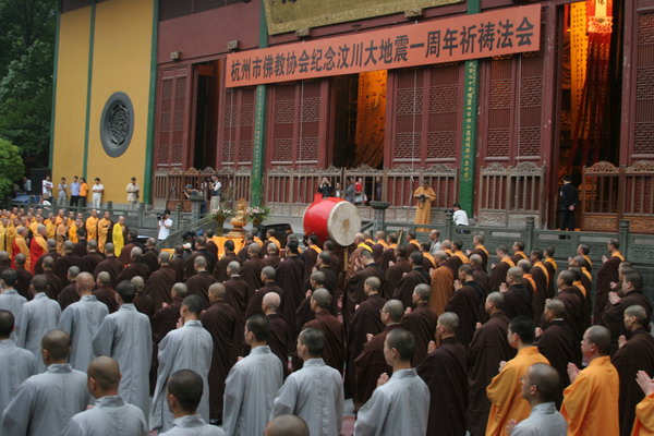 2009年5月12日4时30分,杭州市佛教界各大寺院300余僧众会聚灵隐寺大雄宝殿前,隆重举行汶川大地震一周年祈祷法会,与会大众虔心诵经,超度祈福,藉此表达对地震受难者的哀思,支持和激励灾区人民重建家园的信心。