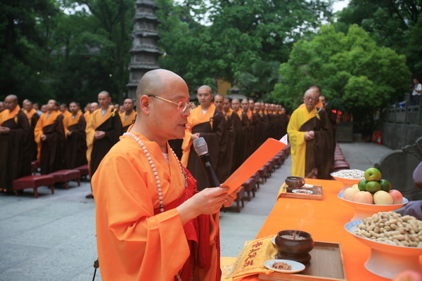 杭州市佛教协会会长、灵隐寺监院光泉法师代表杭州佛教界宣读法会祈愿文,祈愿国家风调雨顺、国泰民安,祈愿灾区人民吉祥安康、和乐幸福,祝福灾区人民早日重建家园,建设美好的生活。
