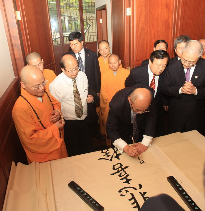 最后,光泉法师代表我寺向客人赠送了《灵隐寺志》等纪念品,吴主席也即兴为灵隐寺题下"慈悲喜舍"的四字墨宝。