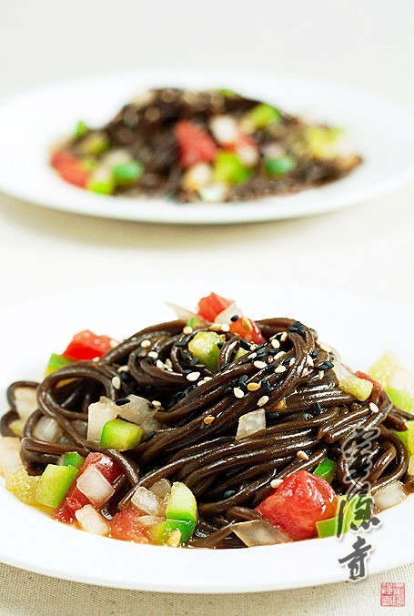 材料:蕨根粉100克水适量西红柿50克青椒50克熟芝麻适量