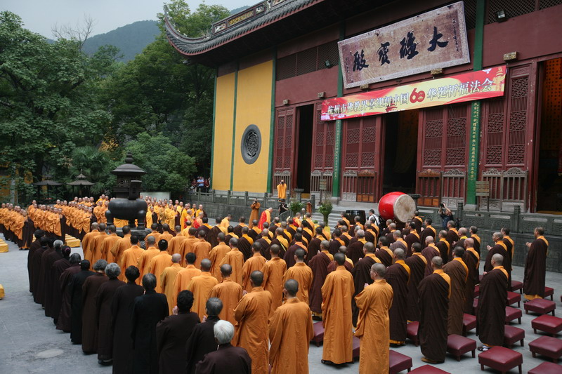9月28日上午,"杭州市佛教界喜迎新中国60华诞祈福法会"在灵隐寺举行。是时,杭州佛教界四众弟子齐集灵隐,沐手焚香,顶礼于三宝座前,诵经祝祷,庆祝中华人民共和国六十华诞,共同祈愿国运昌隆、治道遐昌、八难不起、世界和平。