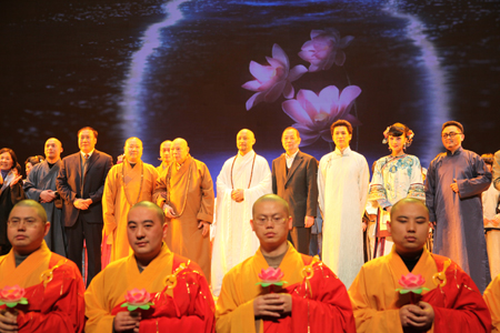 演出结束后一诚长老等上台向全体演员祝贺演出成功