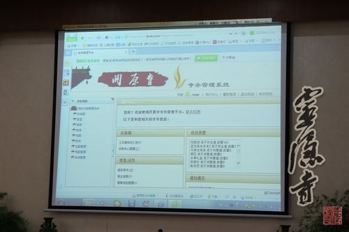 任杰法师详细介绍了开原寺寺院信息化管理系统的内容、开发缘起及运行成效,我寺"取经团"的法师们一边虚心听主人讲解,一边认真的记下每一个细节,随喜赞叹开原寺法师们在坚持佛教传统的基础上,修世间法、求出世果的精进精神。