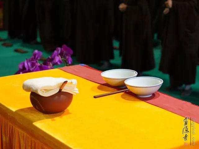 平时在寺院过堂,念完供养咒后结斋,把碗推出去。洗钵水和空碗,筷子放在两碗中间。