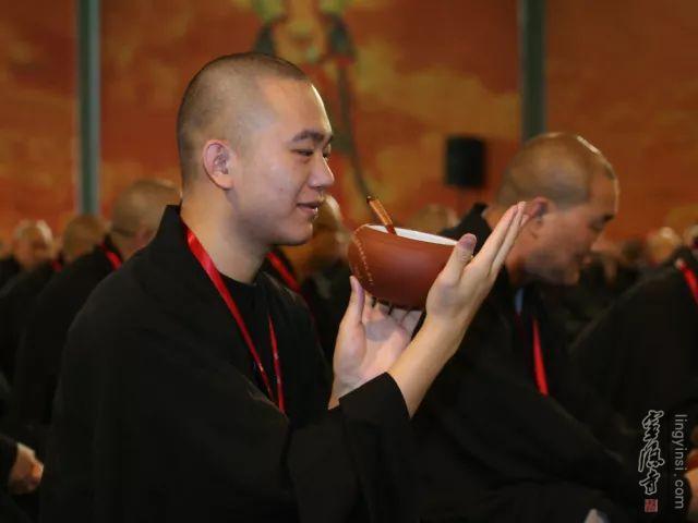 咒语,要念三遍。等到巡堂的过来添饭的时候,我们把这个钵用双手捧起,用左手托住。在添饭的时候,把勺子拿起来,勾住这个边,动作要自然,拿起来勾住钵,有一个倾斜度。