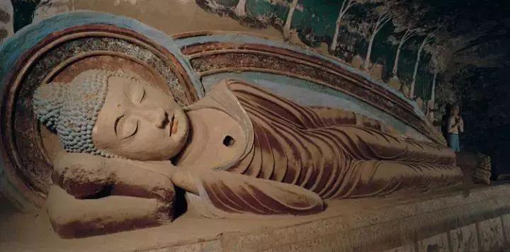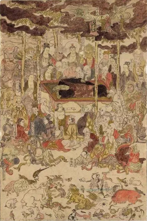 释尊说完最后的遗教,便以狮子般的睡姿在七宝床上卧了下来,右肋朝下,头朝北方,足朝南方,双腿并拢微屈,头枕右臂。之后逐渐进入四禅,直至非想非非想处定,再从非想非非想处定渐次回到初禅,如此重复数遍,终至涅槃。
