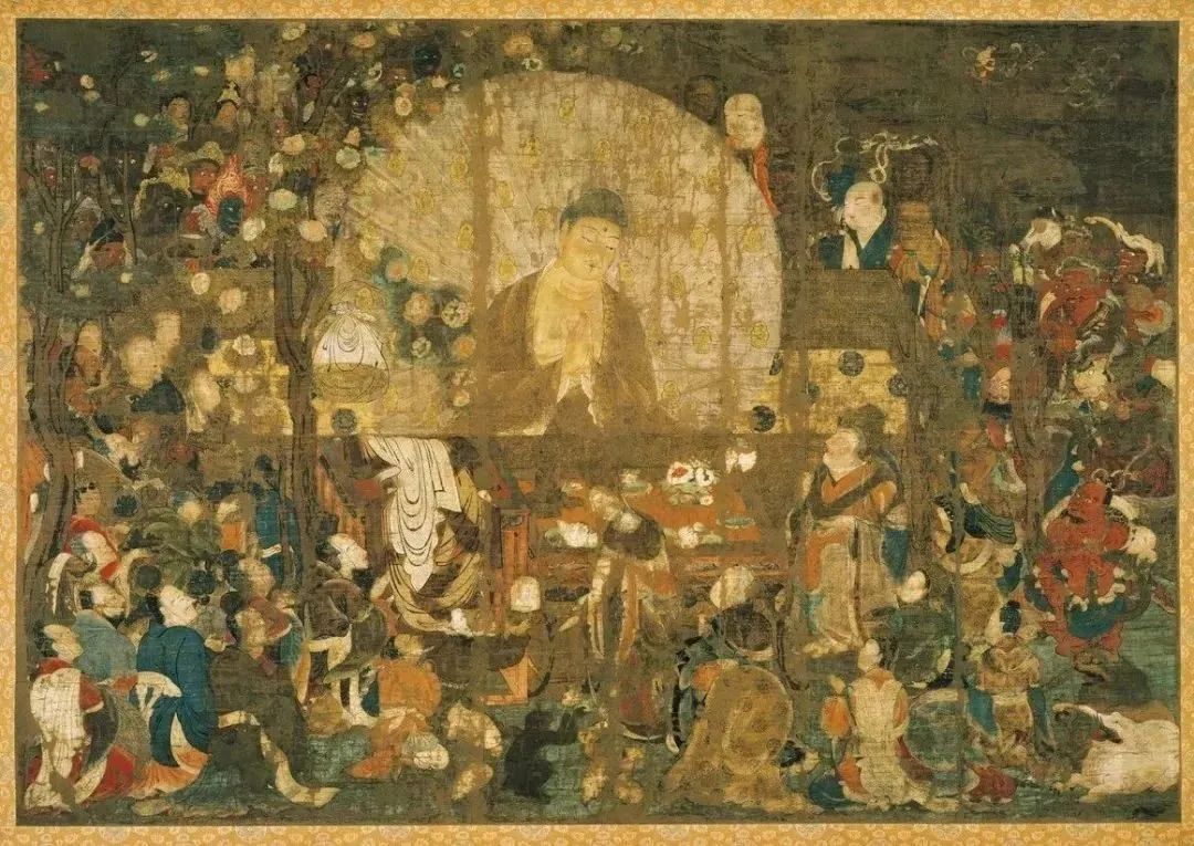 阿难含着悲哀问释尊说:后世的人问起此事,我该怎么说呢?释尊回答:你就说佛已涅槃,慈母摩诃摩耶夫人自天宫降到双林树间,如来为诸不孝众生,从金棺起坐,合掌为母说法。
