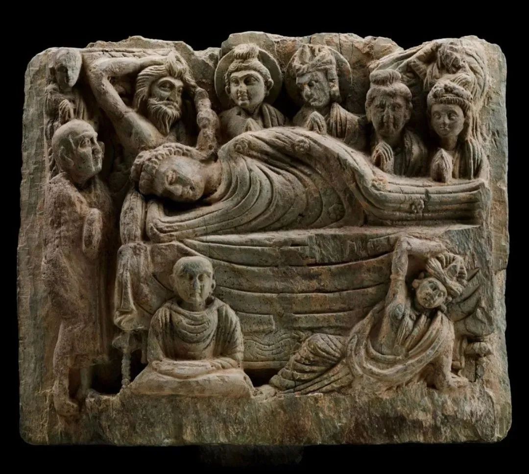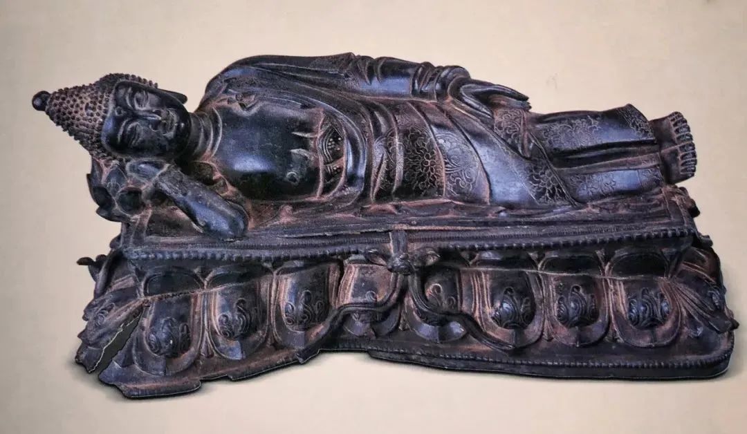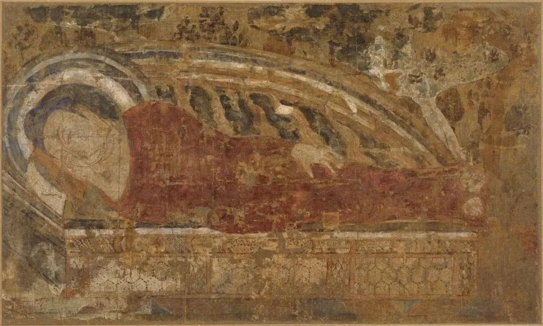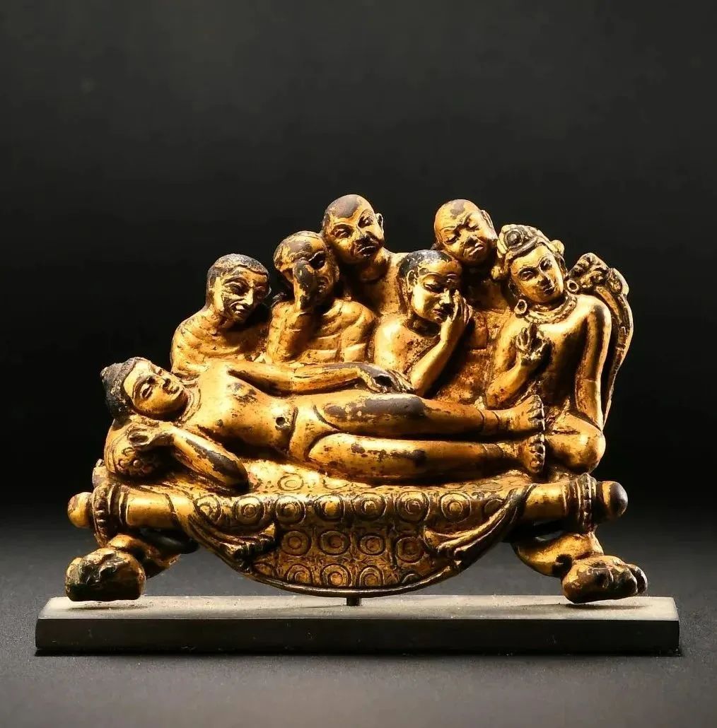 释尊说完最后的遗教,便以狮子般的睡姿在七宝床上卧了下来,右肋朝下,头朝北方,足朝南方,双腿并拢微屈,头枕右臂。之后逐渐进入四禅,直至非想非非想处定,再从非想非非想处定渐次回到初禅,如此重复数遍,终至涅槃。