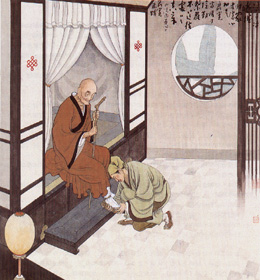 良宽禅师在俗家床上坐禅坐了一夜,次晨离去的时候,就对他的外甥说道:"我想我真是老了,两手直是发抖,可否请你帮忙把我草鞋带子系上?"