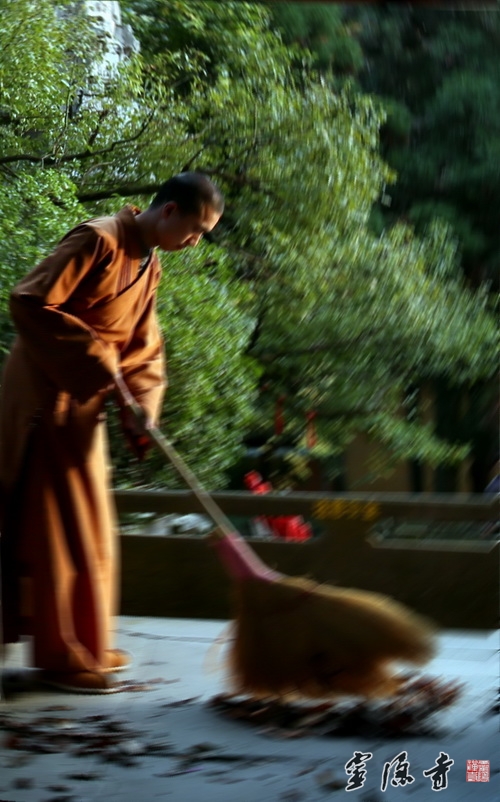 虽然不信,但看到高僧如此严肃,加上亿万的诱惑,这位先生心想扫完这庭院有什么难,就接过扫把开始扫地。过了一个钟头,好不容易从庭院一端扫到另一端,眼见总算扫完了,他拿起畚箕,转身回头准备畚起刚刚扫成一堆堆的落叶时,却看到刚扫过的地上又掉了满地的树叶。