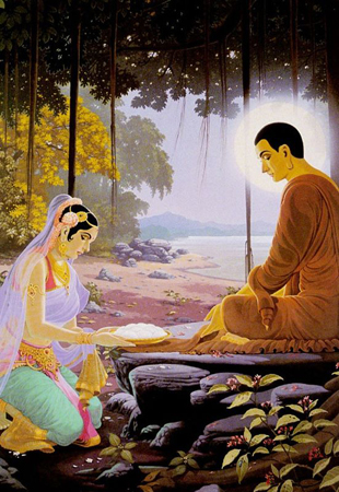 他在雪山苦行六年,常常日食一麦一麻。后来发现一味苦行并非解脱之道,于是放弃苦行下山。这时一位牧女见到他虚弱不堪,便熬乳糜(奶与谷物共煮而成)供养他。释迦牟尼的体力由此恢复,随后于菩提树下入定七日,在腊月初八,夜睹明星而悟道成佛。
