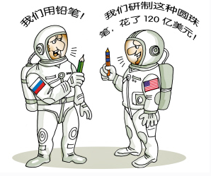 1961年,美国宇航局首次将宇航员送上太空,但他们很快接到报告:宇航员在失重状态下,用圆珠笔和钢笔根本写不出字来。于是,他们用了10年时间,花费120亿美元,终于发明了一种新型圆珠笔,这种笔适用于失重状态、身体倒立、水中、任何平面物体,甚至在摄氏零下300度也能书写流利。当美国人向俄罗斯人炫耀时,却发现俄罗斯人在太空中一直使用铅笔。