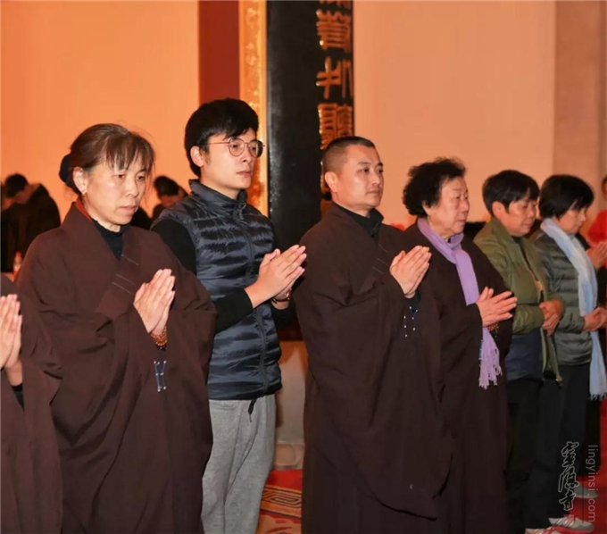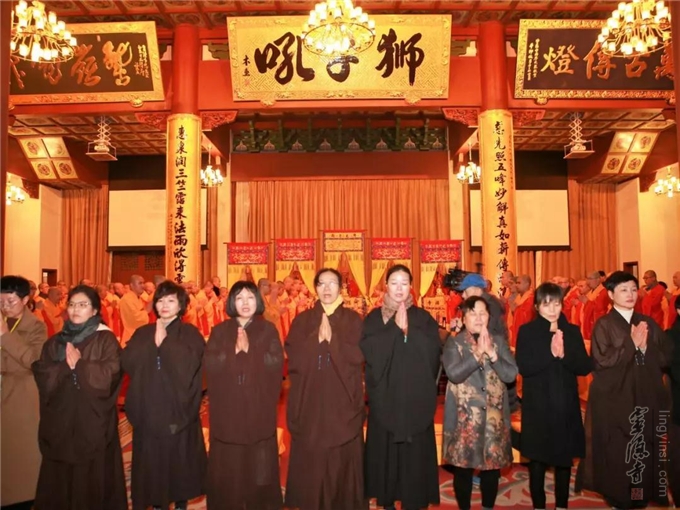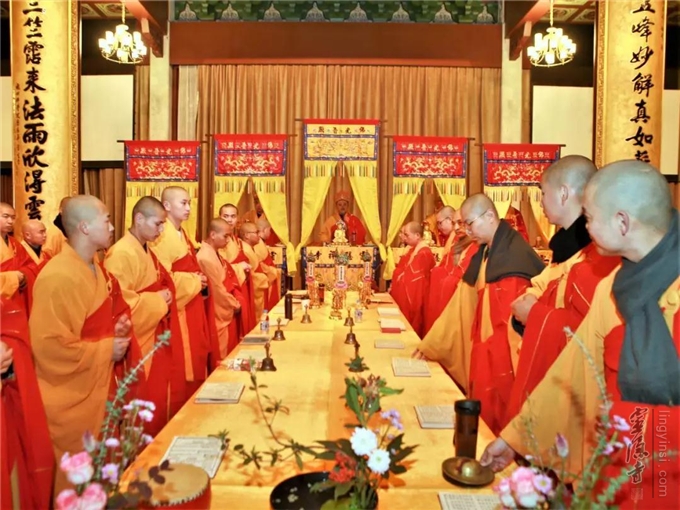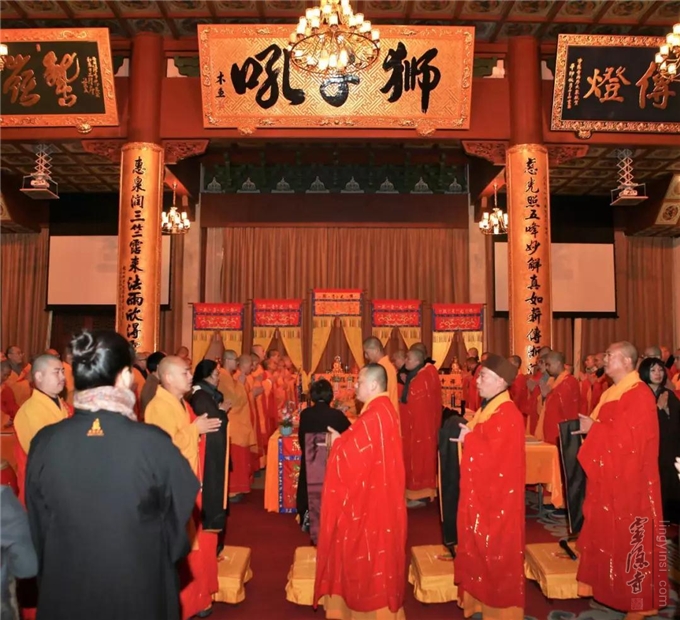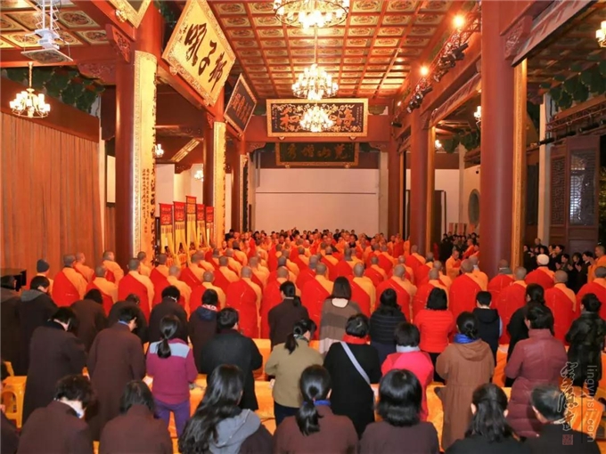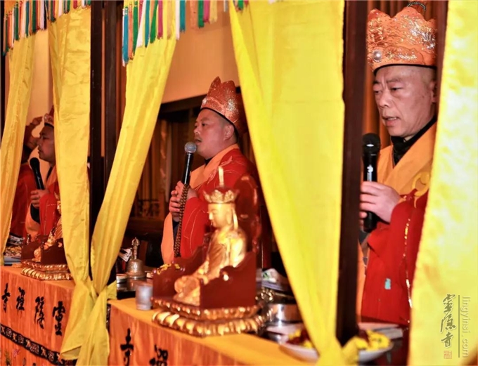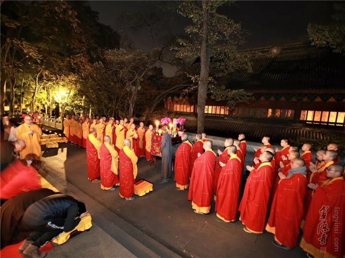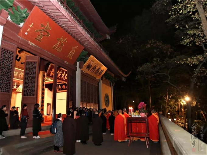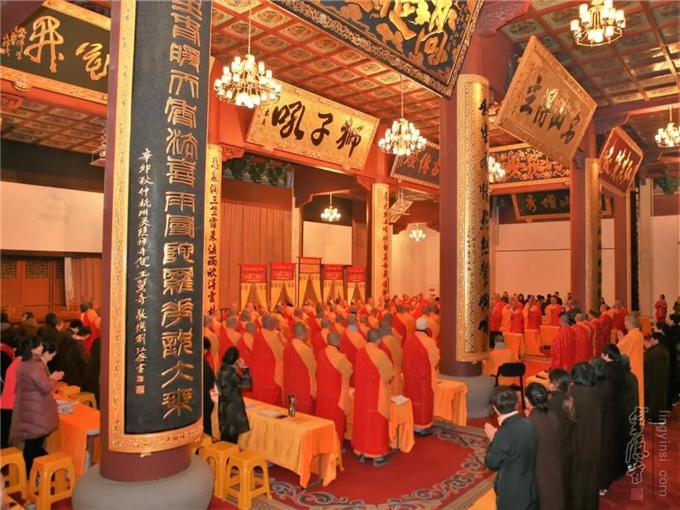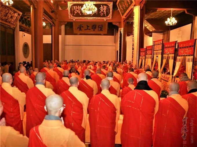 2019年11月25日(农历十月廿九),杭州灵隐寺"己亥法界圣凡水陆普度大斋胜会"进入第六日,水陆内坛第五场瑜伽焰口法会隆重举行,众僧引领来自各地的善信居士参加焰口超度佛事。150多位法师一起诵经念咒、祈福回向。