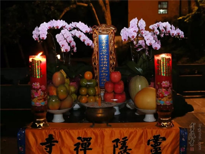 晚上18时30分,五大士瑜伽焰口法会在直指堂举行。主法法师在瑜伽坛前诵《香赞》,引领斋主上香,依僧俗次序礼拜后,众僧及斋主前往面燃大士坛上香礼拜,诵经唱赞。随后,依次前往灵坛和药师殿往生位前上香礼拜。四众弟子讽诵经典,称念"阿弥陀佛",祈愿佛力加持:各界人等,过去世一切冤亲,得令解脱,现在世一切亲朋健康长寿!