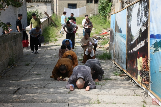 当日上午,光泉大和尚一行到达普陀山之后,即由山门开始,三步一拜,沿着朝山的古道,一路拜至普济寺。无论是火辣辣的太阳所带来的僧衣皆湿的不便,还是崎岖蜿蜒山路所带来的身体上的伤痕,无论是3小时叩拜朝山所致的身体上的劳累,还是沿途游人异样的目光,都不能阻止这群朝山人心中那份坚定的信愿。