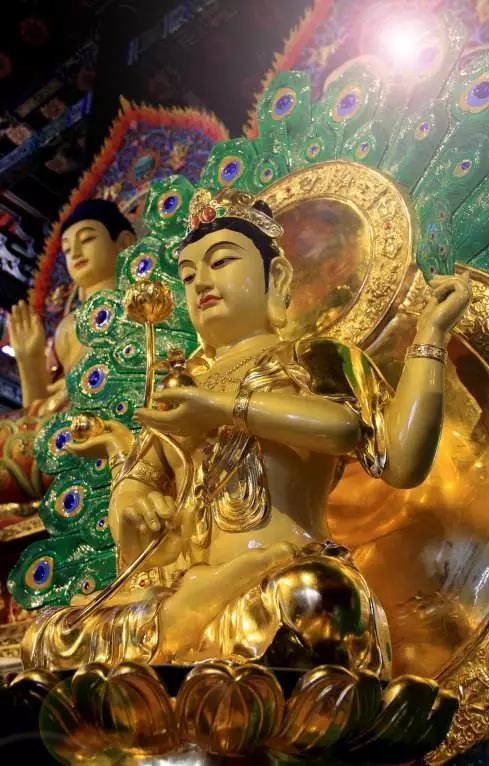 孔雀明王的法门,对于护国、息灾、祈雨、除病延寿安产等世间利益,都极有效验,孔雀明王以毒为食,作为出世间修行的依怙,可袪除贪、瞋、痴、慢、疑等各种烦恼毒害,具足一切敬爱、调伏、增益、息灾的妙用,能够圆满智慧、具足菩提,速成佛果。