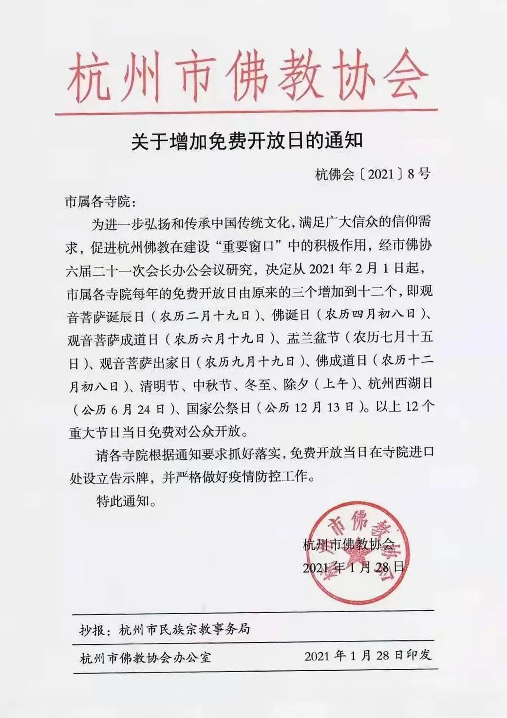 为进一步弘扬和传承中国传统文化,满足广大信众的信仰需求,促进杭州佛教在建设”重要窗口“中的积极作用,经市佛协六届二十一次会长办公会议研究,决定从2021年2月1日起,市属各寺院每年的免费开放日由原来的三个增加到十二个,即观音菩萨诞辰日(农历二月十九日)、佛诞日(农历四月初八日)、观音菩萨成道日(农历六月十九日)、盂兰盆节(农历七月十五日)、观音菩萨出家日(农历九月十九日)、佛成道日(农历十二月初八日)、清明节、中秋节、冬至、除夕(上午)、杭州西湖日(公历6月24日)、国家公祭日(公历12月13日)。以上12个重大节日当日免费对公众开放。