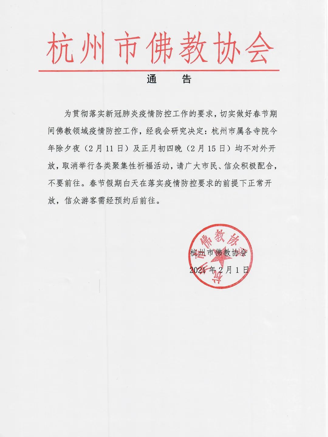 为贯彻落实各级新冠肺炎疫情防控工作的要求,切实做好春节期间佛教领域疫情防控工作,经我会研究决定:杭州市属各寺院今年除夕(2月11日)晚上及正月初四(2月15日)晚上均不对外开放,取消迎新、敬香、撞钟等聚集性祈福活动,请广大市民、信众积极配合。春节假期白天在落实疫情防控要求前提下正常开放,信众游客需经预约后前往。