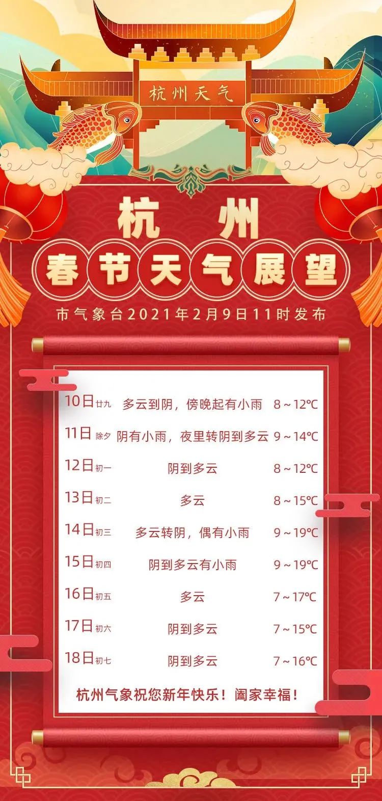 根据市气象台预报,春节假期杭州以多云天气为主,降雨主要出现在10-11日(除夕),气温偏高,出现暴雨、大雪等恶劣天气可能性较小,天气较为平稳,对欢度春节较为有利。
