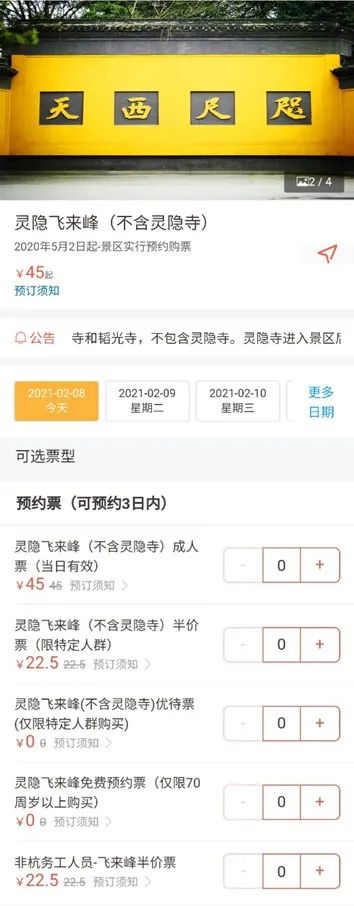 ▲“杭州西湖西溪景区”公众号“灵隐飞来峰”预约页面
