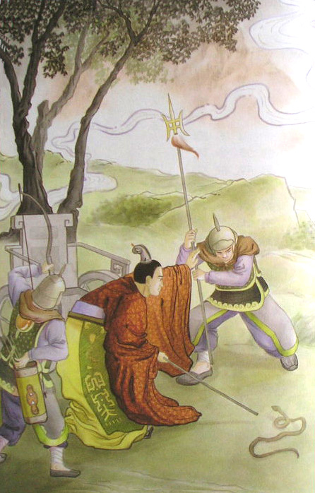 汉姬姓诸侯隋侯,有一次出使齐国,途中见一蛇,被困在热沙滩上打滚,头部受伤流血,隋侯怜悯,急忙以物用药敷治,然后用手杖挑入水边让它恢复体力后游去。