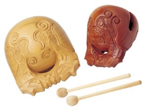 一般,木鱼都是横穿腹部中央,作中空的团栾形,头部、鳞甲、龙珠等多隈以黑漆,押上金箔,其它部分则涂以朱红;安于小布团上,以包皮的木槌敲击腹部中央。至于体积大小,普通是径一尺乃至六尺,较小的则有三寸乃至五寸等。