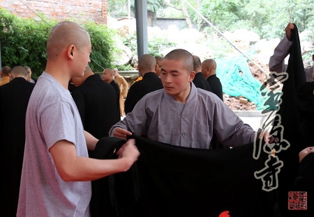 当日上午,开堂芳振大师傅在教礼堂讲怎样穿海青,站立时如何结手印。戒子们分成十八班,在引礼师傅周围围成一圈,引礼师傅们亲自手把手地教新戒弟子怎么穿海青、怎样叠海青,戒子们专心听讲,凝目细看,"一招一式",学得有板有眼、丝丝入扣。